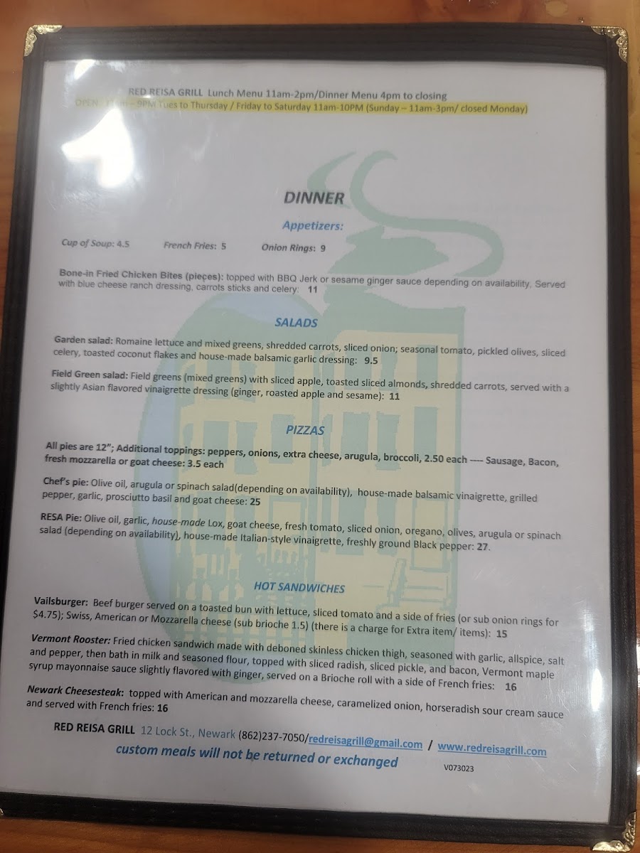 Olive oil, arugula or spinach salad form (depending on availability), house-made balsamic vinaigrette, grilled pepper garlic diced prosciutto, basil and goat cheese. All pies are 12"; additional toppings: peppers, onions, extra cheese, arugula, broccoli $2.50 each / sausage, bacon, fresh mozzarella or goat cheese $3.50 each.